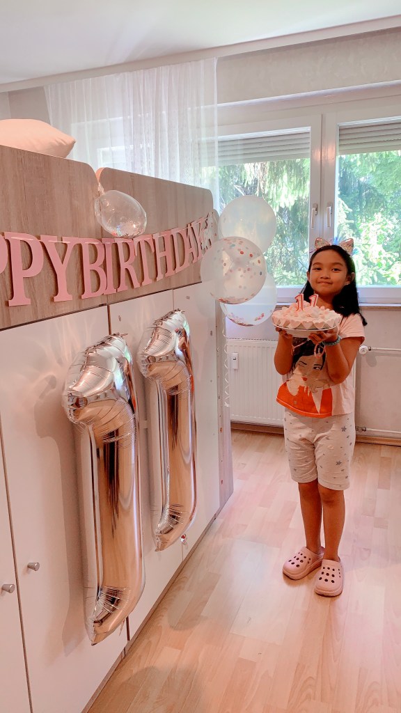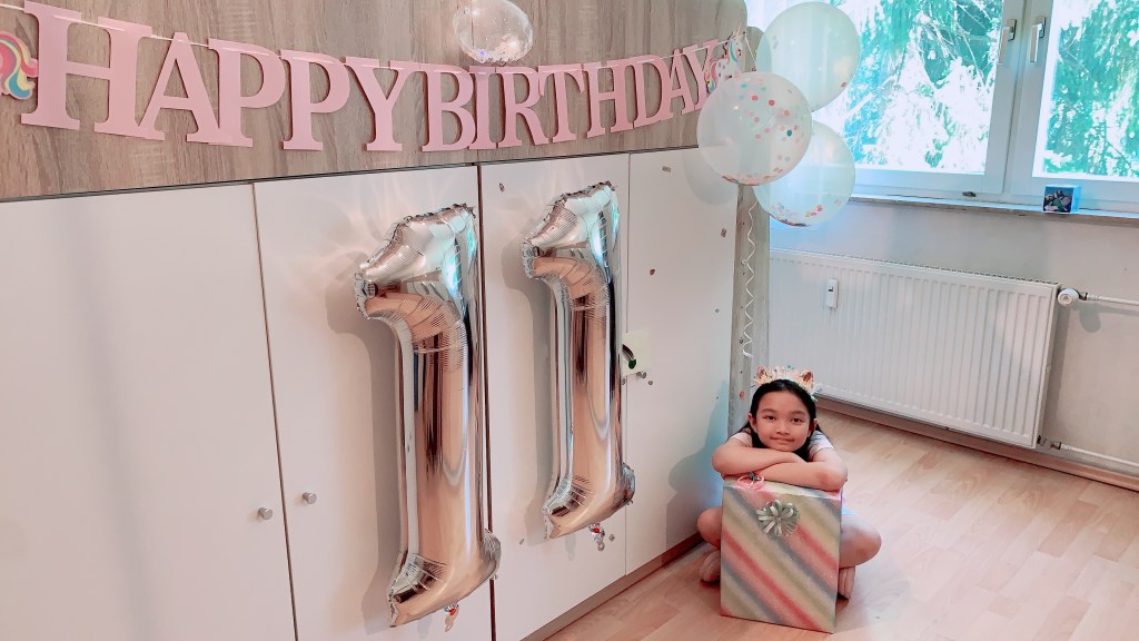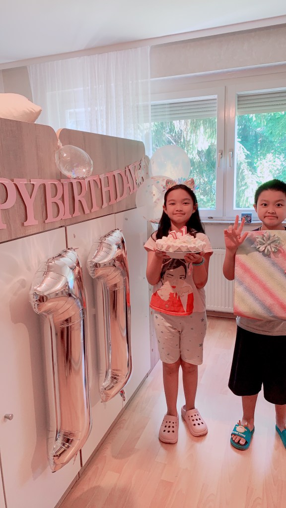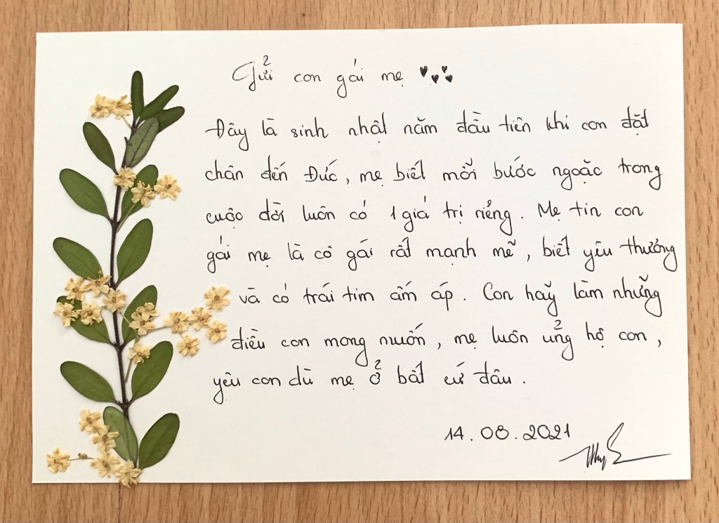 Hôm nay sinh nhật của Su Su, thành quả cả nhà cùng trang trí và cùng làm bánh kemBim Bim cũng được chụp “ké” cùng chịSu Su nhận được món quà to bự chảng từ LV 😉Tấm thiệp đầu tiên gửi con gái khi sinh nhật ở Đức.