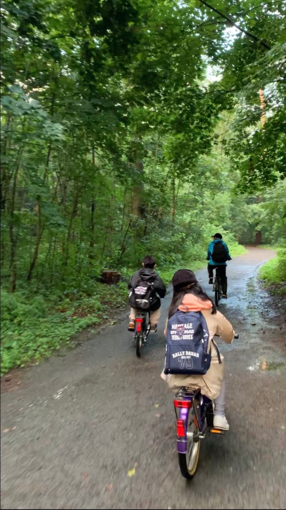 Cùng đạp xe vào rừngĐứng dưới cầu tránh mưaĐến park và gặp …,…. ngựarồi lại lên đường quay trở vềngang qua cầu. Thường sau cơn mưa, con người luôn được thưởng thức những nét đẹp của thiên nhiênRồi ngồi lại nghỉ ngơi bên bờ sôngVới ánh hoàng hôn xa xaTrời tàn và cả nhà cùng nhau trở về